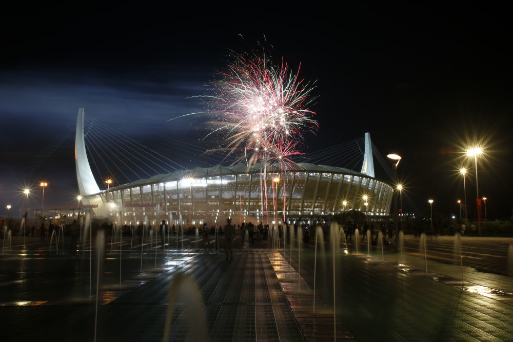 焰火在柬埔寨金边的柬埔寨国家体育场上空燃放(2021年12月18日摄)。当日,由中国政府援建、中国建筑股份有限公司承建的柬埔寨国家体育场项目正式启用。新华社发(索万纳拉摄)